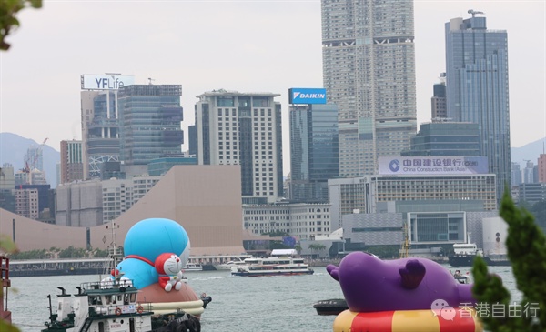 多啦A梦、KAWS & 芝麻街(Elmo)、滑嘟嘟及LABUBU四座巨型海上充气雕塑展示8日以来,已吸引成千上万市民旅客前来驻足观赏打卡,今日更组成「梦幻舰队」,于下午2时正式启航,依次驶离金钟添马公园对开海域,巡游维港两岸两圈,历时逾三小时,为香港献上一场前所未见的海上艺术盛典。