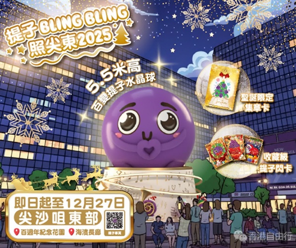 「提子Bling Bling『照』尖东2025」活动精心打造四大打卡位,今年必看焦点装设于尖东百週年纪念花园喷水池上方、高达5.5米的巨型LED球体「百变提子水晶球」,播放「提子」10种可爱表情及圣诞水晶球动画。花园上方亦架设巨型天幕,挂上漫天以「提子」造型设计的闪烁灯饰,营造出沉浸式的「提子圣诞步道」,与「百变提子水晶球」互相辉映。