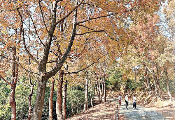 由港铁朗屏站B2出口离开,落天桥后可到达巴士朗屏邨悦屏楼站,在此搭乘K66巴士前往大棠山道。另外,由即日起至1月11日,逢周六、日及公众假期会加开特别班次K66A。沿大棠山道步行进入大榄郊野公园,爬上一段陡峭的石梯,便可来到一处开阔的烧烤场。这里有洗手间和小商店可供补给,站在栏杆边向下望,山坡上是一片绿油油的草地,远处的高楼井然有序,呼吸着新鲜的山风,感到心旷神怡。路标显示,烧烤场距枫香林仍有2公里,需要约30分钟才能到达。继续暴走,途中已经可见不少枫树染上红黄交织的色彩,虽然旁边的树仍是绿色,没有连成一片,但在绿的衬托下,红叶才更加绚烂。