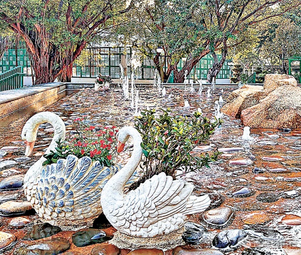 百鸟塔外能听见悦耳的流水声,跟随声音来到百鸟塔下方的瀑布,一道13米高的水流飞泻而下,激起清凉的水花,而后汇入人工湖中。比起瀑布的水花四溅,人工湖则很平静,水清而浅,湖中的鱼和龟清晰可见。今日阳光正好,有两隻龟正趴在乾燥的石面上享受日光,还伸长脖子左顾右盼,很有活力。