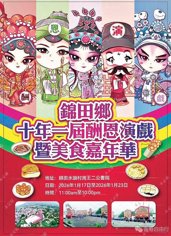 由「锦田乡十年一届酬恩建醮委员会」主办的系列庆典活动「锦田乡十年一届酬恩演戏暨美食嘉年华」,将于1月17日至23日于水头村周王二公书院盛大举行。本次庆典活动以「酬恩演戏、美食嘉年华、狮王争霸」为核心,延续对周王二公复界之恩的感念,更以多元文化体验拉近传统与大众的距离,诚邀全港市民共赴乡土盛宴。