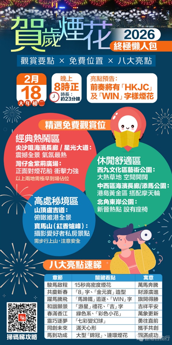 贺岁烟花汇演2月18日(农曆大年初二)再度亮相维多利亚港。这场由香港赛马会独家赞助的盛事,预计将吸引数十万市民及旅客聚首维港两岸,共赏花火照耀香江的动人美景。为你整合汇演详情、8大亮点章节,以及11个视野绝佳的免费观赏位置与交通指南,助你与亲友共佔最佳位置,迎接这份震撼人心的新春贺礼!