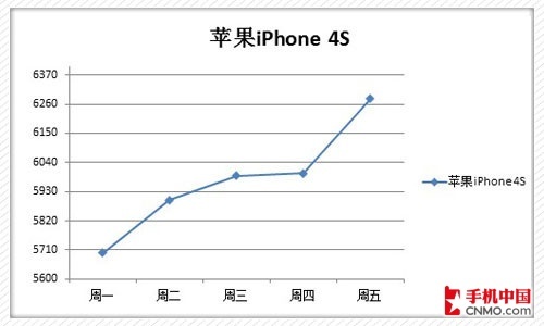 近段时间,苹果iPhone 4S一直是市场关注的焦点。出色的性能表现以及个性化的Siri语音助理功能让它在市场中有着极高的人气。价格方面,从本周走势图中我们能够看出,其售价整体呈现上升趋势,周一水货报价最低,仅为5699元,而截至本周五价格就已飙升至了6280元。