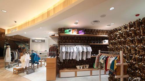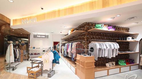 全新香港Ne-net分店以日本专门店的设计为蓝本,当中最令人喜出望外的绝对是可爱趣致的毛毛公仔内墙,是日本专门店用上狮子、企鹅和熊等等以后,香港分店则以老虎作为布置主题。一只又一只可爱的毛毛老虎公仔整齐的伏在墙身上,与品牌充满童真的特色相当配合,加上内里浅色的木条层架和陈列柜,还有纯白色的天花和地面,营造出份外别致又纯真的感觉。专区当中无论橱窗或是旁边挂衣架的位置,均放置着一个两横一竖的木架装饰,这是品牌设计师以木场围栏为灵感而设计出代表着”和平”的符号,透过融入在室内设计当中而宣扬和平的讯息。另一充满特色之处,是衫架上都印上了”14”这个号码,那可是设计师的幸运号码!Ne-net专区把快乐、和平、幸运,还有少不了的美丽衣饰都统统带到香港。