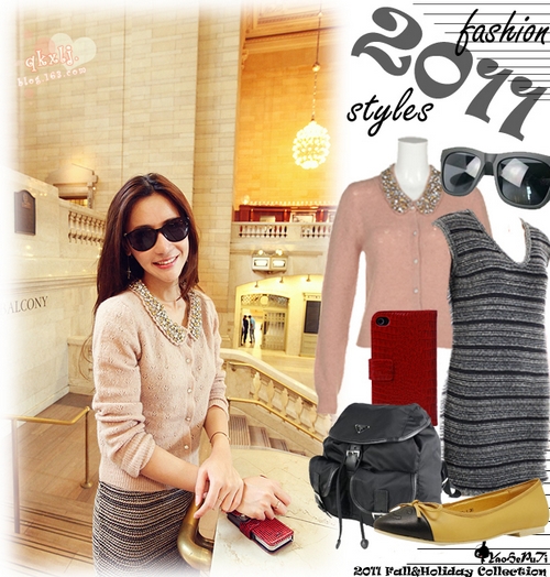 名媛味十足的粉色针织开衫,搭配特别的条纹连衣裙,再拿个皮质感十足的IPHONE套,整套搭配质感十足。