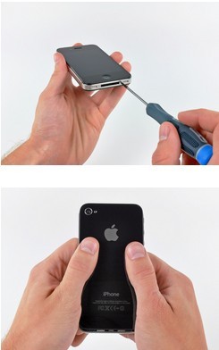 拧下iPhone 4底部两颗螺丝,将后盖向上推即可打开