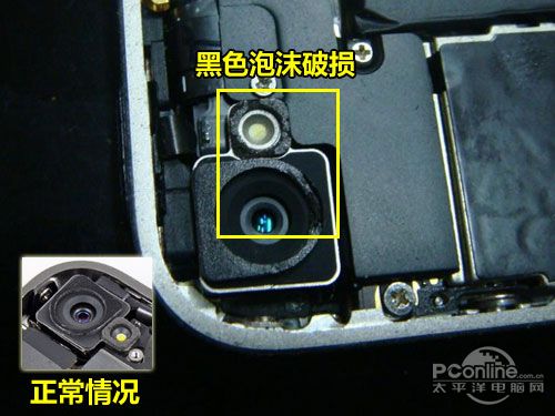 1、摄像头处边沿的黑色防震膜破损,全新iPhone 4不可能出现这种情况。