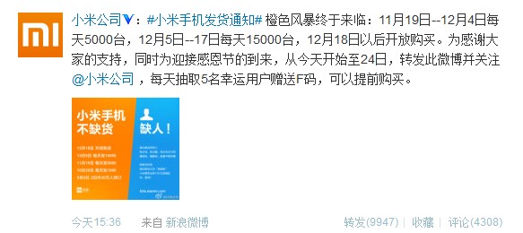 11月18日消息,小米公司通过其官方微博公布了“正式发货”计划,具体内容为:11月19日到12月4日发货量提升至每天5000台、12月5日到12月17日每天15000台,12月18日开放购买。