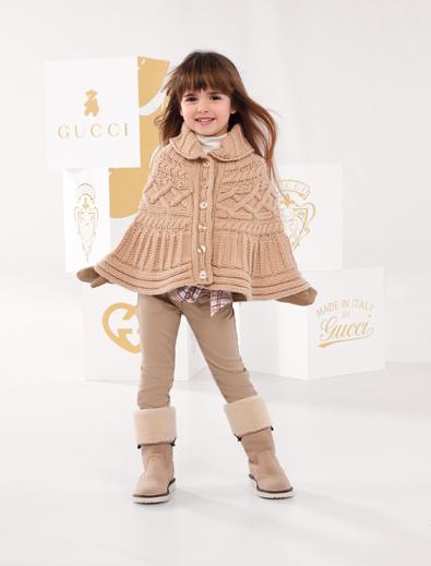 古驰(Gucci)的婴儿系列采用经典的粉红和蓝色,但调色板上仍不乏今季最新颜色,包括浅灰色、米色、橙色和绿色。产品物料亦主要着重婴儿穿着衣服活动时的柔软性、伸展性和方便性,例如采用羊毛、羊绒、幼细的麦利诺羊毛及纯鹅毛羽绒,均成为这个秋冬系列中不可或缺的布料。