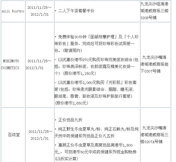 尖沙咀商厦林立,而其中海港城当之无愧是众商场中的地标。这个“地标”的意义除了表现在每逢圣诞节,海港城的圣诞灯饰都是一大观光景点外,更重要的是海港城拥有超过450间各类型商店,及50间中西食肆,是全港最大型的购物商场。门店及品牌的数量之大,意味着你的购物欲有了更多的选择,同时刷卡便能享受更多的折扣优惠!光临闻名遐迩的Mikimoto Cosmetics 即可享30分钟免费面部按摩护理服务,或到Niji Bistro 以半价尊享二人下午茶套餐。如此厚待,只有在银联缤纷冬日赏才有。