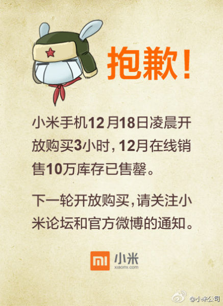 开放购买三小时后,小米手机就宣告售罄,小米发布公告称:“12月在线销售10万库存已售罄。下一轮开放购买,请关注小米论坛和官方微博的通知。”