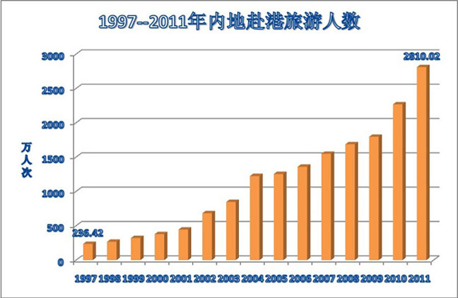 中国网7月6日讯 来自国家旅游局港澳台司的消息称,1997年内地赴香港旅游236万人次,2011年为2810万人次,增长11倍,年均增长18%。2011年,内地赴港游客人均消费5249港元,过夜游客人均消费8220元港元。