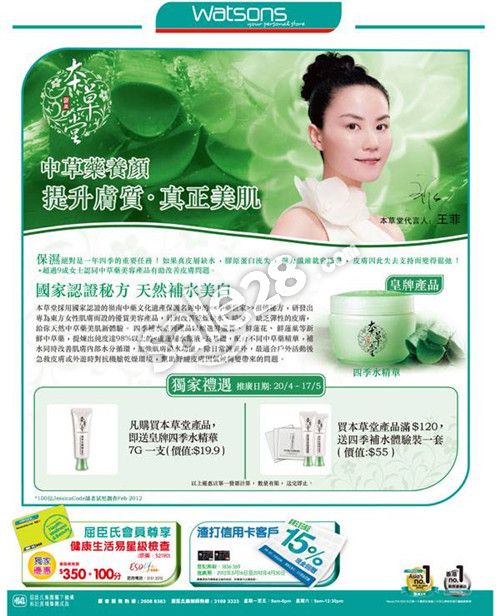 香港屈臣氏又有优惠活动啦,本草堂优惠购物,凡购买系列产品,即送价值$19.9的皇牌四季水精华7G一支,买满$120,还可获赠价值$55的四季补水体验装一套。喜欢本草堂的产品的女性朋友要记下咯。